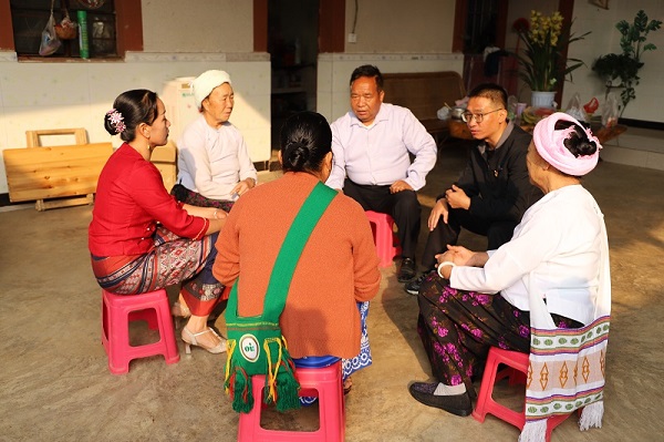 孟連縣紀委監委以一線監督為契機,走進農戶家中,及時向群眾宣傳全國兩會精神和黨的惠民政策。圖為該縣紀檢監察干部在娜允鎮芒街村傣族四組農戶家中宣講。 (劉松琳 攝)