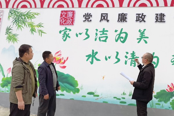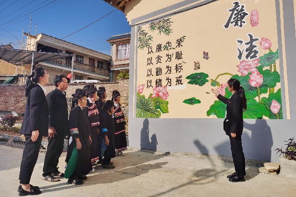 “廉語”畫墻上,“廉意”記心間。西疇縣紀委監(jiān)委不斷豐富載體形式,通過打造廉潔文化墻,用圖文并茂的方式,把廉潔文化融入群眾生活,進一步增強廉潔文化的滲透力和感染力。圖為該縣新馬街鄉(xiāng)紀委干部在坡腳村委會石碑村小組向群眾“說廉”。(李吉靜 攝)