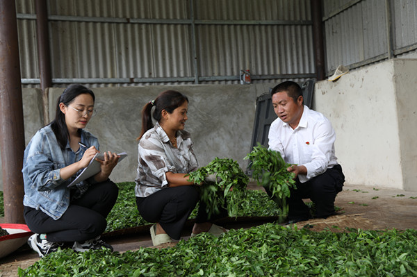 鳳慶縣紀檢監察干部積極踐行“一線工作法”,聚焦群眾普遍關注、反映強烈和反復出現的問題跟進監督。圖為鳳慶青年紀檢監察干部在向茶農了解群眾身邊的不正之風。 (史艷菊 攝)