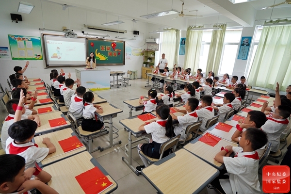 國慶節前夕,浙江省臺州市椒江區實驗小學組織開展主題班會,讓學生們深入了解國情,培養學生們的愛國熱情。圖為老師為學生們介紹國慶節的來歷、新中國成立以來的奮斗歷程,學生們和老師積極互動。(浙江省臺州市椒江區紀委監委供 羅誠嫻 攝)