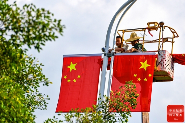 為迎接祖國華誕,江西省定南縣為各個街道掛上了嶄新的國旗,營造出濃厚的節日氛圍,激發廣大人民群眾的愛國熱情。圖為工作人員懸掛的五星紅旗迎風飄揚,裝點了節日里的喜慶氣氛。(江西省贛州市定南縣紀委監委供 袁海斌 攝)