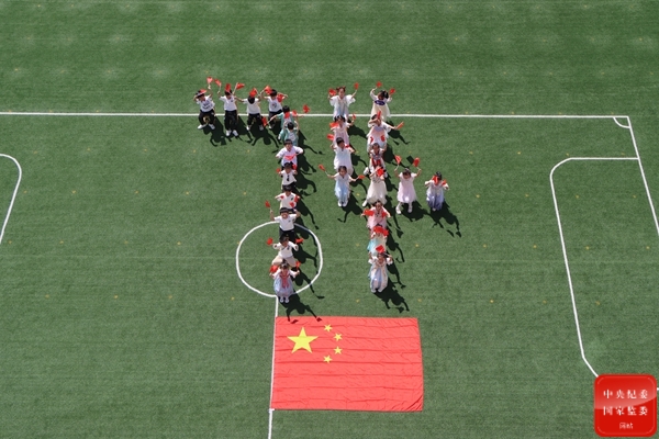 河南省鄭州航空港經濟綜合實驗區一家幼兒園組織開展迎國慶活動,讓愛國主義情懷在每個孩子心中生根發芽。圖為小朋友們揮舞國旗、組成陣型,慶祝祖國母親74歲華誕。(河南省鄭州航空港區紀檢監察工委供 張軍營 攝)