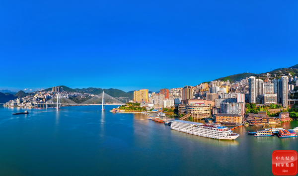 在秋日暖陽的映射下,長江航道湖北省恩施州巴東段天藍水碧、山水相連、城景相融,呈現出一幅“高峽出平湖”的美麗畫卷,讓人心曠神怡。(湖北省巴東縣紀委監委供 譚平 攝)