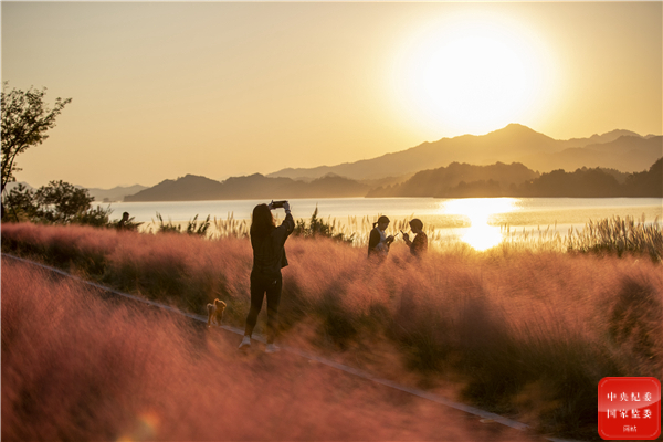 秋日時節,杭州市淳安縣文昌鎮西陽村沿線的粉黛亂子草進入最佳觀賞期,吸引過往游客駐足拍照留影。(國網杭州供電公司紀委供 王鑫 攝)