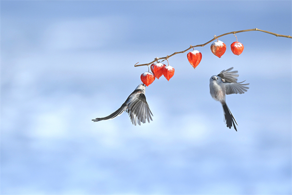 冬至雪落,寒意脈脈,在昆明轎子雪山,盈盈紅花蓋上雪被,山雀歡快地嬉鬧著,欲在紅花中尋到甜蜜花蜜。(靳嶺 攝)