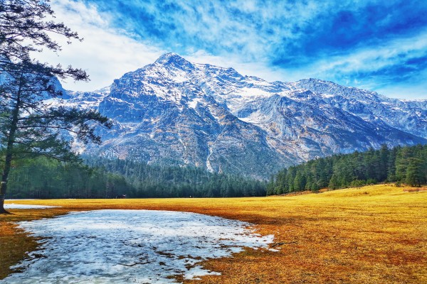 麗江云杉坪風景治愈,時光悠然,綿延的草甸、林線、冰川、雪峰由近至遠,層層推移,立體景觀,多姿多彩。草甸在冬日暖陽的照耀及雪水的沁潤下,漸漸滋生萌發。(舒英妹 攝)