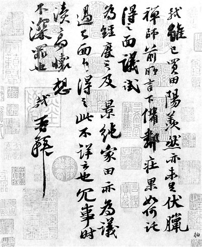 文字不長,姑錄如下,“軾雖已買田陽羨,然亦未足伏臘。禪師前所言下備鄰莊,果如何?讬得之面議,試為經度之。及景純家田,亦為議過,已面白得之,此不詳云也。冗事時瀆高懷,想不深罪也。軾再拜。”這是蘇軾告知朋友,其已經在陽羨(今江蘇宜興)買田,但是耕種地方不大,難以滿足全家生活所需,請朋友再為他尋找合適的田地。