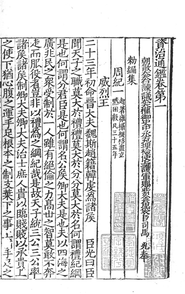 中國國家圖書館藏《資治通鑒》書影。司馬光修此書時,有幾位重要助手,其中范祖禹以唐史見長,范祖禹一家是北宋以修史而聞名的家族。 圖片來源:《國家珍貴古籍名錄》知識庫