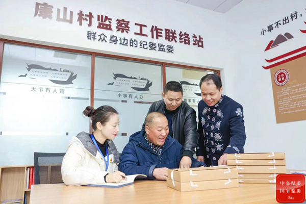 圖為安吉縣紀委監委干部正在遞鋪鎮康山村帶領村監察工作聯絡站成員學習《清廉正村八條要求》,督促村干部依紀依法履職。殷興華 攝