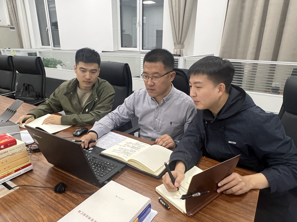 圖為張坤(中)正在與同事一起復盤工作完成情況,研究下一步工作。王一粟 攝