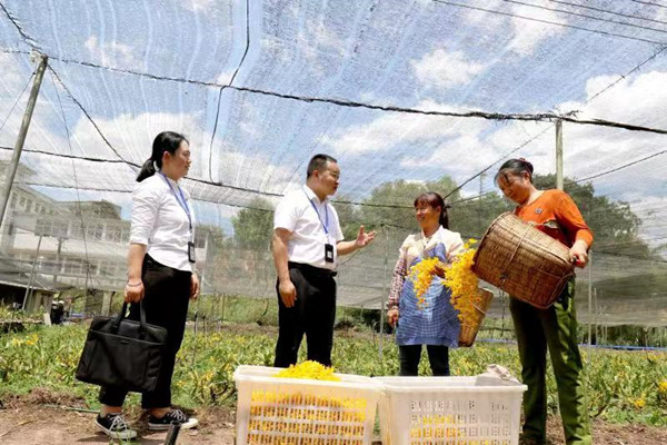 圖為王廷建(左二)在南屏鎮南島河村石斛種植基地向種植戶核查相關問題線索。旺珍 攝