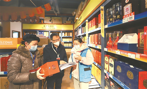 元旦期間,四川省成都市錦江區紀委監委派出5個監督檢查組,深入名煙、名酒專賣店和商場超市等場所,對機關單位、黨員干部公款購買高檔煙酒、茶葉等“四風”問題進行監督檢查。圖為該區紀檢監察干部在轄區某煙酒專賣店了解有關情況。封金劍 攝