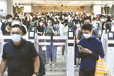 近日,深港口岸出入境雙向客流繁忙。圖為5月3日,旅客經深圳羅湖口岸入境。新華社記者 梁旭 攝