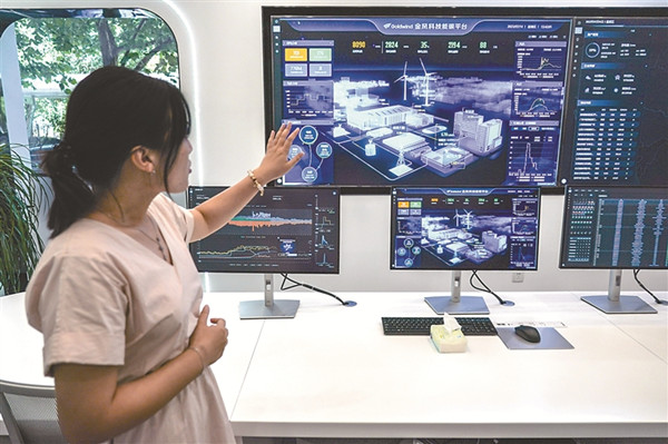 北京金風科技亦莊智慧園區是北京綠色交易所認證的可再生能源“碳中和”智慧園區,引入風力發電、分布式光伏、地源熱泵和水蓄冷等清潔能源,搭建了一套以清潔能源為主的智能微電網能源體系。圖為近日,工作人員介紹園區內的能耗數據。新華社記者 彭子洋 攝