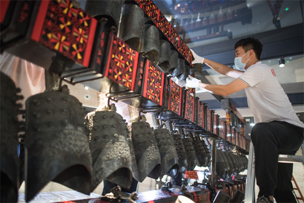 湖北省博物館工作人員對(duì)曾侯乙編鐘進(jìn)行調(diào)試安裝(2021年10月15日攝)。新華社記者 肖藝九 攝