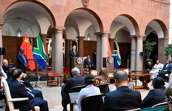 當前,中國共產黨正團結帶領中國人民以中國式現代化全面推進中華民族偉大復興,南非也在積極自主探索符合本國國情的發展道路。中南關系面臨新的發展機遇。剛才,我同拉馬福薩總統舉行了富有成果的會談,就新時代兩國關系發展以及共同關心的國際和地區問題交換了意見,達成重要共識。我們見證了一系列重要雙邊合作文件簽署。我對兩國友好合作關系前景充滿信心。
