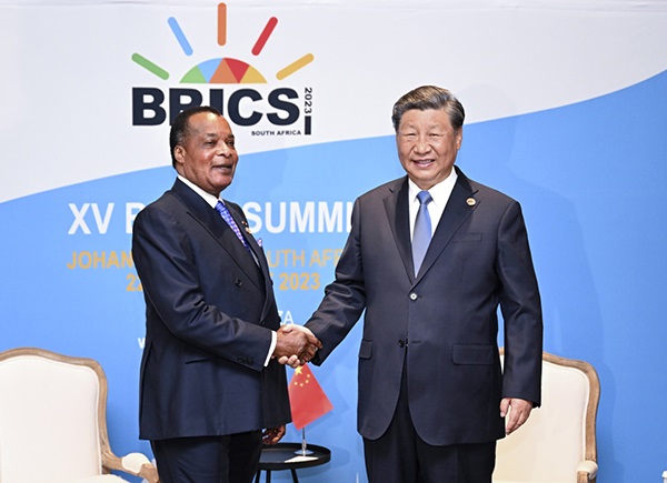 當(dāng)?shù)貢r(shí)間8月24日上午,國(guó)家主席習(xí)近平在約翰內(nèi)斯堡出席金磚國(guó)家領(lǐng)導(dǎo)人會(huì)晤期間會(huì)見(jiàn)剛果(布)總統(tǒng)薩蘇。新華社記者 謝環(huán)馳 攝