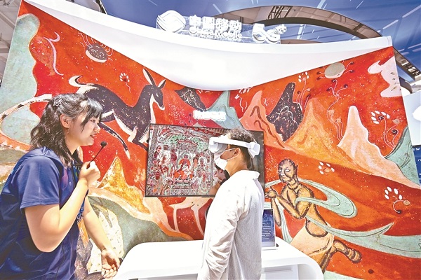 圖為9月3日,在中國國際服務(wù)貿(mào)易交易會上,一名參觀者在首鋼園中國移動展臺體驗基于5G、AR/VR等技術(shù)的敦煌導(dǎo)覽,沉浸式感受敦煌壁畫的魅力。新華社記者 李鑫 攝