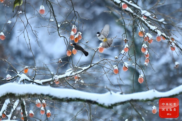 小寒時節,雪花紛紛落在柿子樹上,金燦燦的柿子掛滿枝頭,引來鳥兒前來啄食、嬉戲,成為寒冬時節靚麗的風景。(貴州省鳳岡縣紀委監委供 楊勁松 攝)