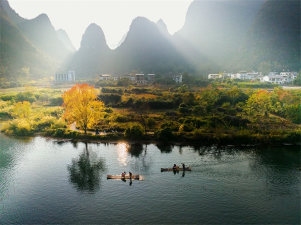 冬日的暖陽斜灑在遇龍河畔,沐浴著夕陽余暉的村莊安靜而祥和。金光映照在波光粼粼的河面上,襯著婆娑的樹影,猶如世外桃源,游人愜意地乘著竹筏徜徉在靜謐的山水畫卷中。(廣西壯族自治區(qū)陽朔縣紀委監(jiān)委供 夏立慧 攝 )