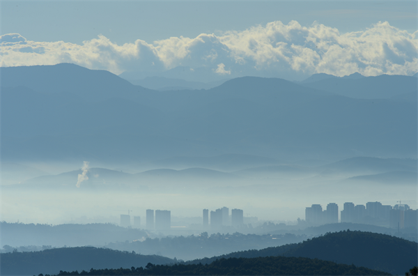 冬日,云霧中的城市若隱若現(xiàn),城市上空時而風(fēng)起云涌、時而煙云飛散,云層之下的群山和高樓煙波浩渺,美輪美奐,仿佛人間仙境,壯美不已。(云南省建水縣紀委監(jiān)委供 盧維前 攝)