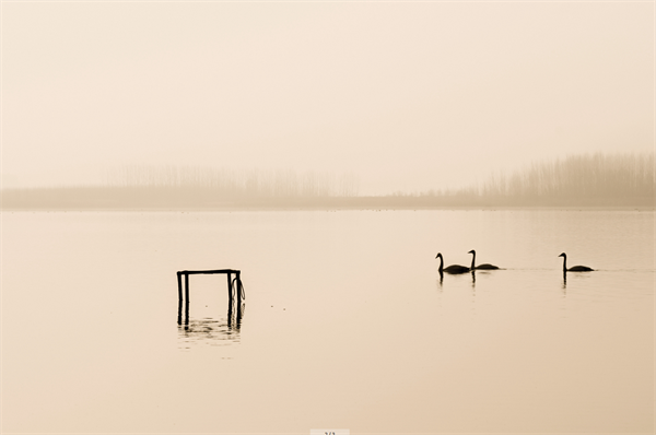 朝陽初露,霧氣起而漫滿湖,氤氳如仙境,三只天鵝從湖面滑過,沉寂的天地頓時為之生動鮮活。(河南省新密市紀委監(jiān)委供 朱留波 攝)