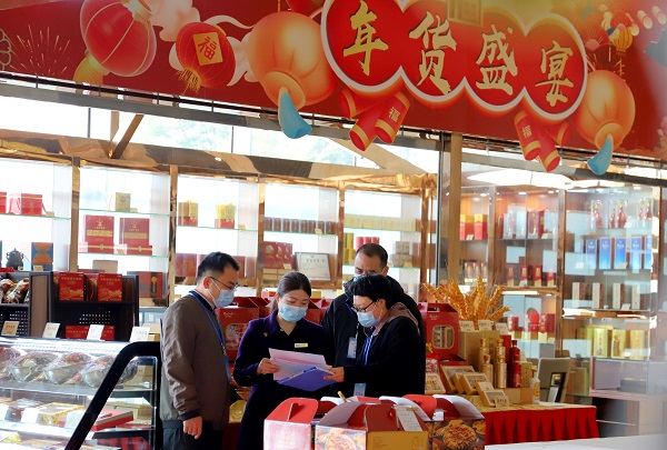 春節(jié)期間,廣西壯族自治區(qū)梧州市紀(jì)委監(jiān)委以“室組”聯(lián)動方式,組建7個明察暗訪組開展監(jiān)督檢查,強(qiáng)化正風(fēng)肅紀(jì)。圖為1月21日,該市紀(jì)檢監(jiān)察干部走訪部分商超,了解是否存在違規(guī)發(fā)放年貨福利問題。(廣西壯族自治區(qū)梧州市紀(jì)委監(jiān)委 呂曉藝 攝)
