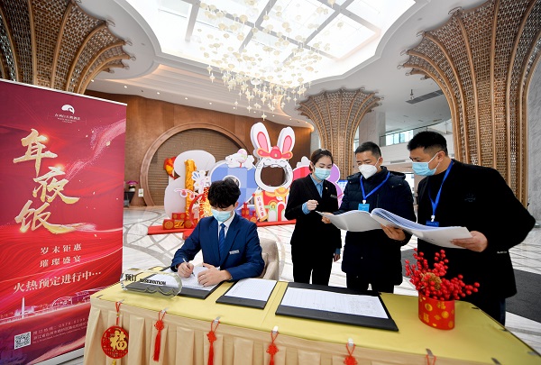 春節(jié)期間,浙江省臺州市各大酒店訂餐火爆。該市路橋區(qū)路北街道紀(jì)工委聚焦公款吃喝、違規(guī)吃請年夜飯等問題開展監(jiān)督檢查。(浙江省臺州市路橋區(qū)紀(jì)委監(jiān)委供 王保初 攝)