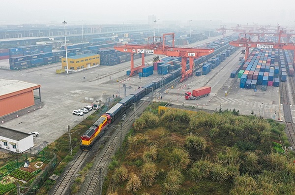 △2023年1月22日,農(nóng)歷新年首趟西部陸海新通道鐵海聯(lián)運(yùn)班列從重慶團(tuán)結(jié)村中心站發(fā)車(無(wú)人機(jī)照片)。