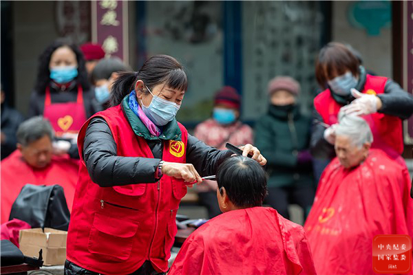 近日,杭州市淳安縣千島湖鎮開展雷鋒志愿服務活動,志愿者到社區義務為老年人提供理發、修腳、推拿等便民服務。圖為助老志愿服務隊在施家塘社區公園為老人義務理發。(國網杭州淳安縣供電公司紀委 余麗艷 攝)