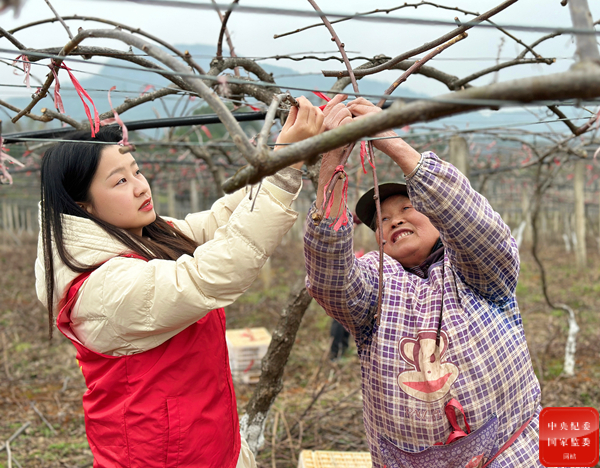 江西省上高縣紀檢監察干部組成志愿服務隊,深入春耕生產第一線,開展服務“三農”忙春耕活動,以實際行動幫助農戶搶抓農時,助力鄉村振興。圖為紀檢監察干部志愿者幫助農戶給獼猴桃樹綁枝、修剪。(江西省上高縣紀委監委供 陳武 攝)