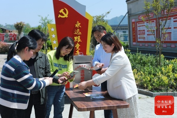 2023年“三八”婦女節來臨之際,湖北省竹山縣紀檢監察女干部深入基層一線,在農村文化廣場、村委會等地集中宣傳紀檢監察信訪舉報受理范圍、方式、流程和舉報人權利義務等,現場發放相關宣傳材料,普及信訪舉報相關知識。圖為竹山縣紀檢監察信訪室女干部王芳在潘口鄉龍王溝村設立“流動舉報箱”,收集問題線索。(湖北省竹山縣紀委監委 袁海成 攝)