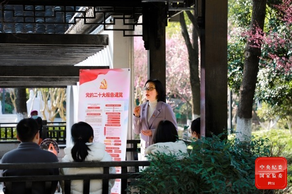 深入農村、社區、企業公司、學校、群眾當中,廣泛宣傳黨的二十大報告中的新思想、新論斷、新提法、新舉措,凝聚干事創業熱情,浙江省海寧市女紀檢監察干部宣講團成為一道靚麗風景線。圖為該市海洲街道紀委書記徐娓娓在市區梅園公園向群眾宣講黨的二十大精神。(浙江省海寧市紀委監委 王磊 攝)