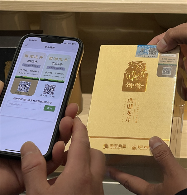 “茶標(biāo)”是西湖龍井茶官方防偽溯源專用標(biāo)識(shí),通過(guò)手機(jī)掃碼并輸入防偽碼,便可查詢真?zhèn)巍j愱?攝