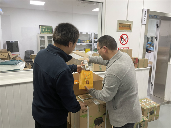 工作人員在茶行庫(kù)房查看正在打包的茶葉。陳昊 攝