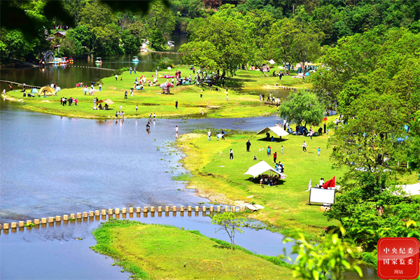 立夏時節,萬物繁茂。在貴州省錦屏縣敦寨鎮雷屯村的沙洲上,樹木蔥郁、綠草成茵。人們趁著好天氣,紛紛到此暢游山水、體驗民俗、欣賞美景。(貴州省錦屏縣紀委監委供 龍煜 攝)