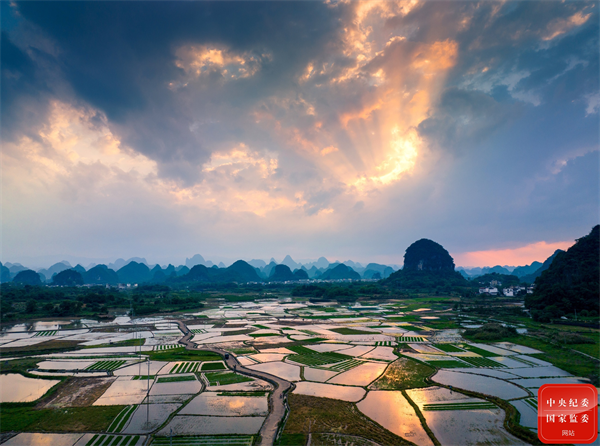 廣西壯族自治區陽朔縣葡萄鎮的農田灌滿了水,傍晚時分,在霞光的映射下,宛如一面面鏡子,鑲嵌在群山懷抱之中。(廣西壯族自治區陽朔縣紀委監委供 夏立慧 攝)