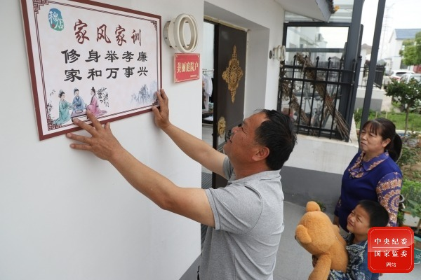 好家庭離不開好家風的滋養(yǎng)。江蘇省盱眙縣以“家家幸福安康工程”為抓手,通過組建家庭教育聯(lián)盟、招募家庭教育志愿者、開展家風家教系列主題活動等方式,培育好家風、涵養(yǎng)好家教。圖為該縣穆店鎮(zhèn)某美麗家庭戶在家中掛起家風家訓牌。(江蘇省盱眙縣紀委監(jiān)委供 張夢媛 攝)