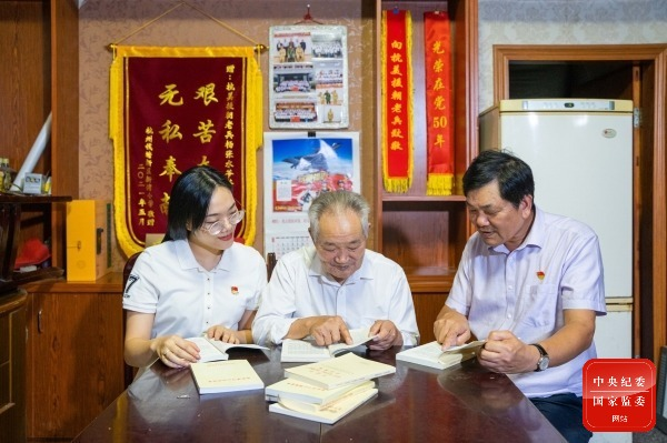 杭州市錢塘區(qū)義蓬街道發(fā)揮榜樣引領作用,宣傳新時代家庭觀,積極推動形成愛國愛家、共建共享的社會主義家庭新風尚。圖為該街道南沙村一退伍軍人家中,祖孫三代一起學黨史、傳家風。(杭州市錢塘區(qū)紀委監(jiān)委供 楊佳彬 攝)