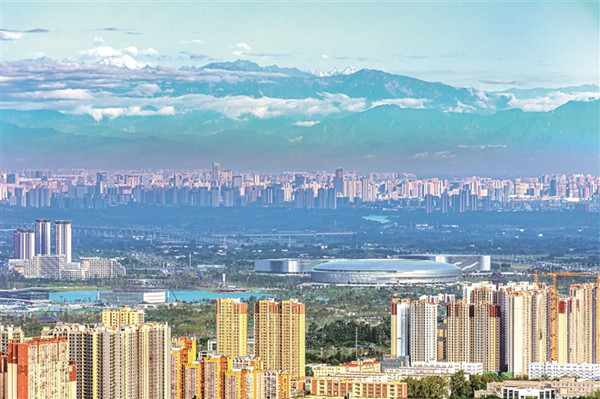 在天府之國四川,神秘莫測的三星堆,折射出中華遠古文明的輝煌歷史,實證中華文明的多元一體格局;聞名于世的都江堰,滋潤出富庶綿長、煙火人間的幸福長卷。圖為成都市區建筑物以及遠處的西嶺千秋雪。 圖片來源:視覺中國