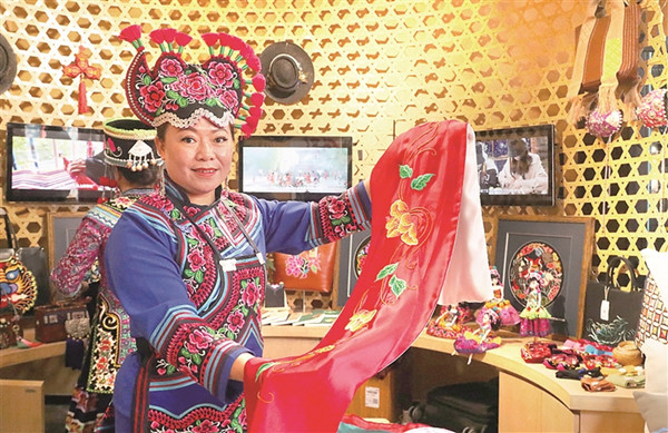 北京蒙藏學(xué)校舊址(中華民族共同體體驗(yàn)館)內(nèi),來自云南楚雄州永仁縣的彝族刺繡傳承人李濟(jì)雁展示彝族刺繡工藝。中華文明具有突出的包容性,從根本上決定了中華民族交往交流交融的歷史取向。 圖片來源:視覺中國