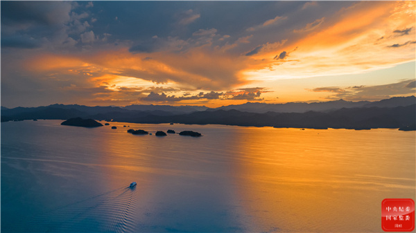 在三伏天的高溫中,落日熔金,湖面碧波蕩漾,夜游船來回穿梭在杭州千島湖畔,觀賞霞光萬丈的日落美景。(國網杭州供電公司紀委 王鑫 攝)