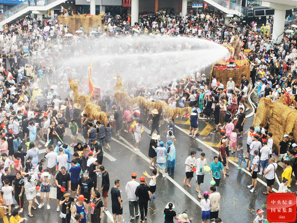 盛夏七月,熱情似火。貴州省德江縣癸卯年六月六“水龍節”活動在縣城如期舉行。烈日當空,人們潑的水揮灑成瓢潑大雨,水車也前來助興,舞動的草龍穿梭其中,奔走追逐的人群盡情歡鬧。(貴州省德江縣紀委監委供 覃冠中 攝)