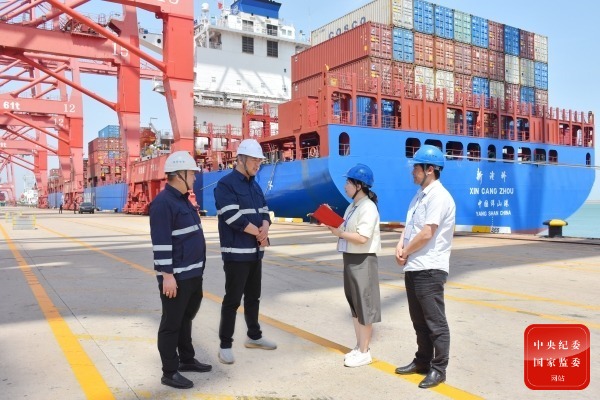 江蘇省連云港市紀(jì)委監(jiān)委注重抓實(shí)年輕紀(jì)檢監(jiān)察干部“墩苗”工作,安排年輕紀(jì)檢監(jiān)察干部在監(jiān)督執(zhí)紀(jì)工作一線接受鍛煉,提升本領(lǐng)。圖為該市紀(jì)委監(jiān)委派駐十一組年輕干部在連云港港口碼頭對(duì)國(guó)有企業(yè)廉潔風(fēng)險(xiǎn)隱患開展監(jiān)督檢查。(江蘇省連云港市紀(jì)委監(jiān)委 劉昕 攝)
