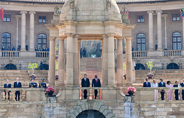 8月的比勒陀利亞,晴空萬里,惠風和暢。總統府廣場鮮花盛開,中南兩國國旗迎風飄揚。在總統摩托車隊護衛下,習近平乘車抵達總統府,拉馬福薩在下車處熱情迎接。兩國元首登上檢閱臺。儀仗隊行持槍禮,軍樂隊奏中南兩國國歌,現場鳴放21響禮炮。習近平檢閱南非儀仗隊。兩國元首同雙方陪同人員一一握手。