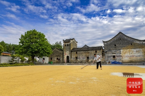 處暑滿地黃,家家修廩倉。南方處暑后逐漸進入豐收的季節(jié)。在廣東省連州市東陂鎮(zhèn),村民在門樓前曬稻谷,天空蔚藍、滿地金黃,構成一幅鄉(xiāng)村振興豐收圖景。(廣東省連州市紀委監(jiān)委供 羅敏 攝)