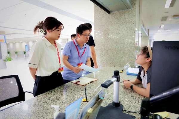 寧波市北侖區紀委監委聚焦窗口“一網通辦”改革,建立健全基層窗口監督體系,助力提升企業、群眾辦事效率及辦事滿意度,推動服務事項從“可辦”向“辦好”轉變。圖為該區紀檢監察干部向窗口工作人員了解情況。(寧波市北侖區紀委監委 陳荔 攝)