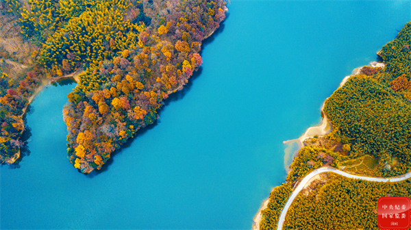 位于安徽省廣德市四合鄉的接龍湖早已換上了節日的盛裝,以碧水為裙,以楓林做裳,用五彩斑斕裝點著大美中國。(安徽省宣城市廣德市紀委監委供 王孟 攝)