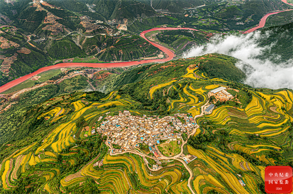 層層疊疊、錯落有致的梯田換上了黃綠相間的秋裝,溫柔地把村莊包裹,山腳下的紅河似紅色飄帶蜿蜒流過,美不勝收。(云南省建水縣紀委監委供 張澤 攝)