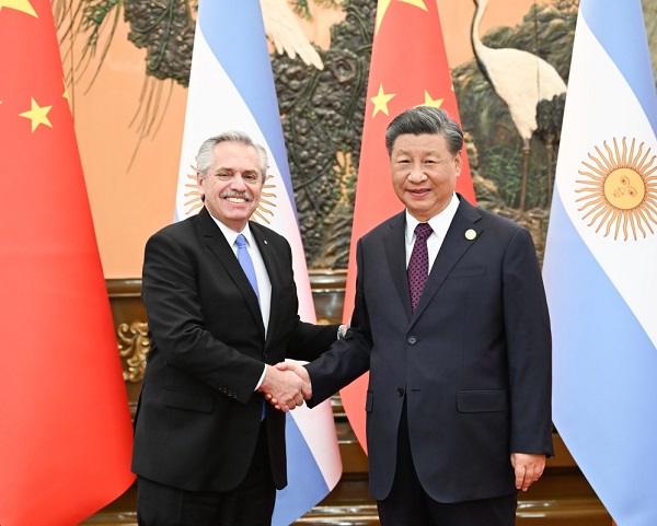 習近平祝賀阿根廷獲邀加入金磚國家合作機制,指出中阿要在聯合國、二十國集團、金磚合作機制等框架內加強戰略協調,推進落實全球發展倡議、全球安全倡議、全球文明倡議,推動構建人類命運共同體。中方一貫支持拉美和加勒比地區一體化進程,愿同阿根廷和其他拉美和加勒比國家一道,推動中拉論壇建設和中拉關系發展。